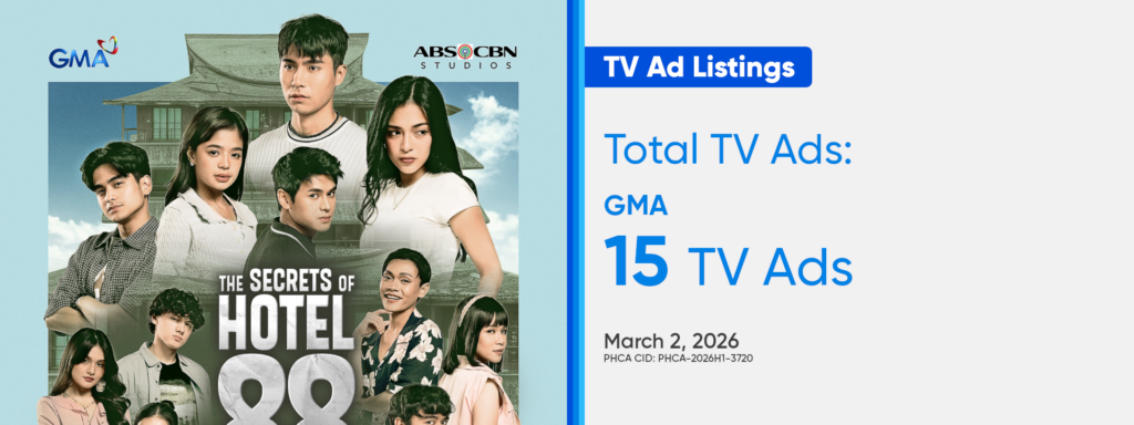 Total Number of TV Ads: 15 (GMA) - TV Ad Listings: What Lies Beneath on ABS-CBN (March 2, 2026)